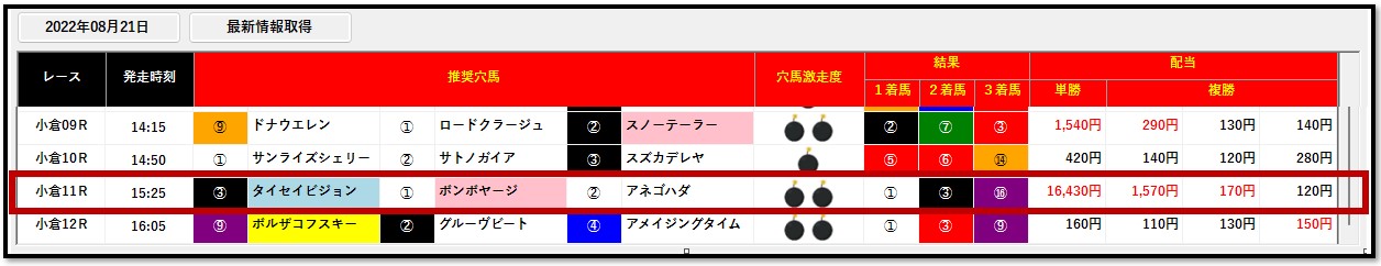 単勝16人気164.3倍ながら1着に入線したボンボヤージを穴馬殿が2頭目で捉えました。1頭目のタイセイビジョンも2着に入線し、馬連は461.9倍となっています。フルゲート・夏競馬(ローカル)・ハンデ戦と荒れる要素が揃ったレースでこそ穴馬殿が真価を発揮します。